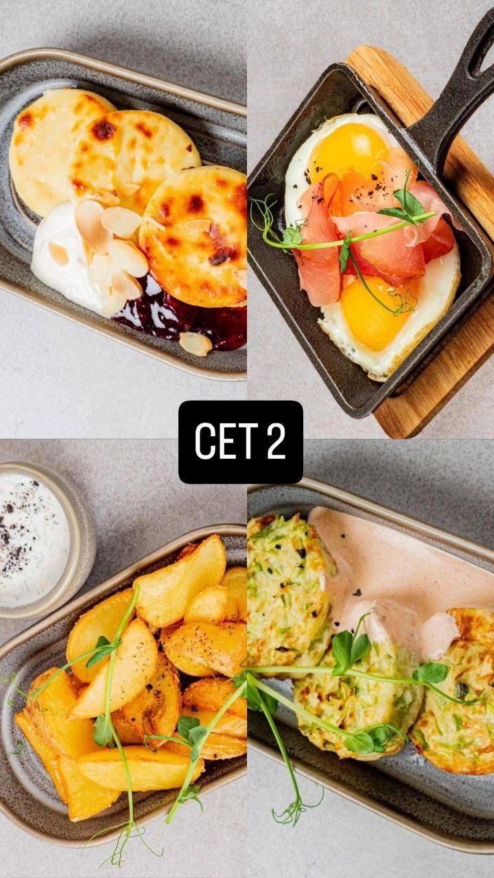 СЕТ 2, 32 BYN: Оладьи из цукини с копчёной сметаной и зеленью, Сырники со сметаной и соусом из вишни, Глазунья с вяленым мясом, Картофель по-деревенски с соусом дзадзики + Сок/Кола/Вода 0,2 л