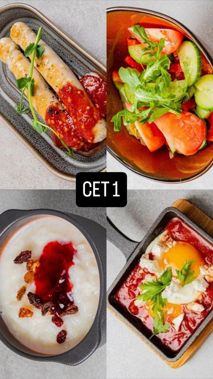 СЕТ 1, 32 BYN: Шакшука с сыром фета и зеленью, Салат со свежими овощами в медово-горчичной заправке, Домашние колбаски на гриле с горчично-томатным соусом, Каша рисовая с изюмом и вишнёвым соусом + Сок/Кола/Вода 0,2 л