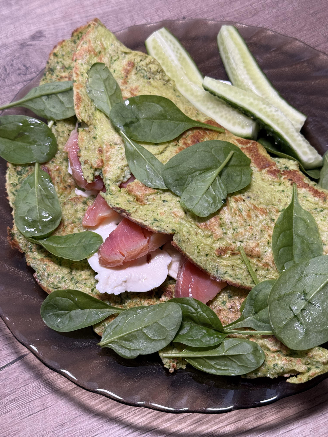 Овсяный блин со шпинатом , с начинкой из твороженый сыра и слабосоленого кижуча .